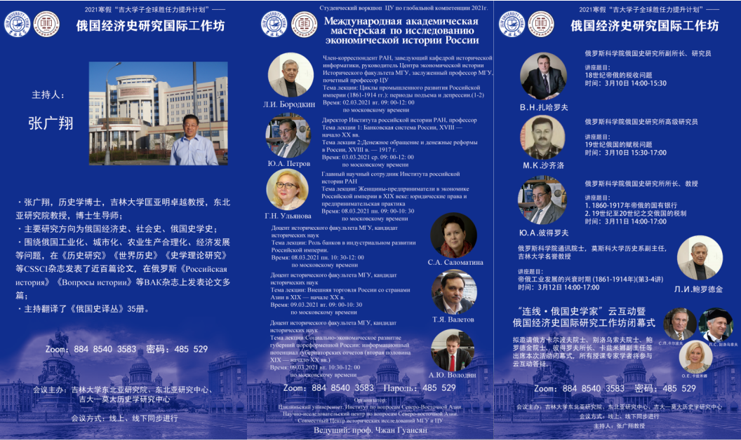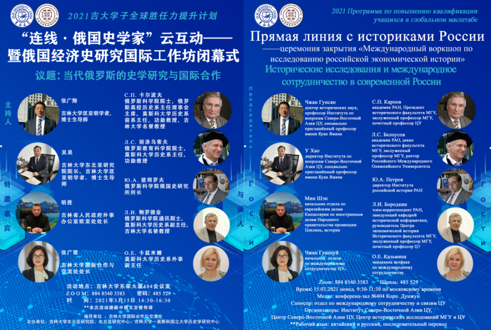 From March 2nd to 15th, 2021, the 2021 Jilin University Global Competency Enhancement Program: International Workshop on Russian Economic History Research was successfully held in Jilin University. The event was co-sponsored by the Northeast Asian Studies College of Jilin University, the Northeast Asian Research Center of Jilin University, and the Jilin University-Moscow State University History Research Center, and guided by the Office of Global Engagement of Jilin University, and was carried out online and offline at the same time. More than 10 top scholars in the field of Russian historiography, including experts and scholars from many fraternal universities and scientific research institutions in China, as well as academicians С.П. Karpov, Academician Л.С. Belousov, Academician Л.И. Borodkin, Professor Ю.А. Petrov and other top scholars from Moscow State University and the Russian Academy of Sciences, gathered on line to build quality universities together, bringing a wonderful historical feast to the students of Jilin University , and at the same time deeply discussed and looked forward to the results and development prospects of cooperation between China and Russia in the field of Russian history. The two-week series of international workshops culminated on March 15th .