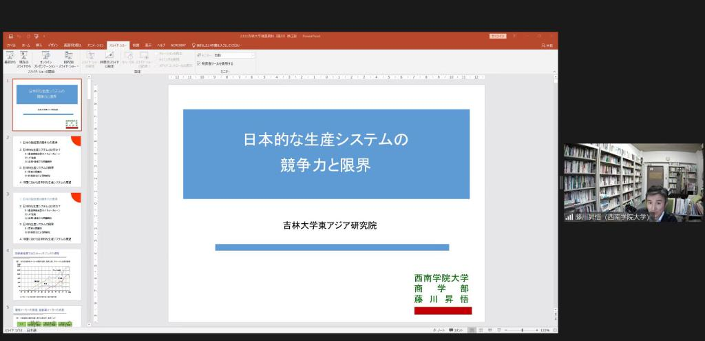 On December 3rd, 2021, Professor FUJIKAWA SHOGO of the Faculty of Commerce of Seinan Gakuin University, Japan, delivered an online lecture on "Competitiveness of Japanese-type Production System and its Limitations" at the invitation of the Northeast Asian Research Center of Jilin University, the Northeast Asian Studies College of Jilin University, the Institute of Northeast Asian Studies, and the Institute of Japanese Studies of Jilin University. The lecture was held simultaneously both as an online lecture and in person. Associate Professor Li Hongmei, deputy director of the Institute of World Economics, Northeast Asian Studies College of Jilin University, was the moderator and on-site interpreter. The lecture was attended by some faculty members, postgraduate students and Ph.D. students from the Northeast Asian Studies College of Jilin University.