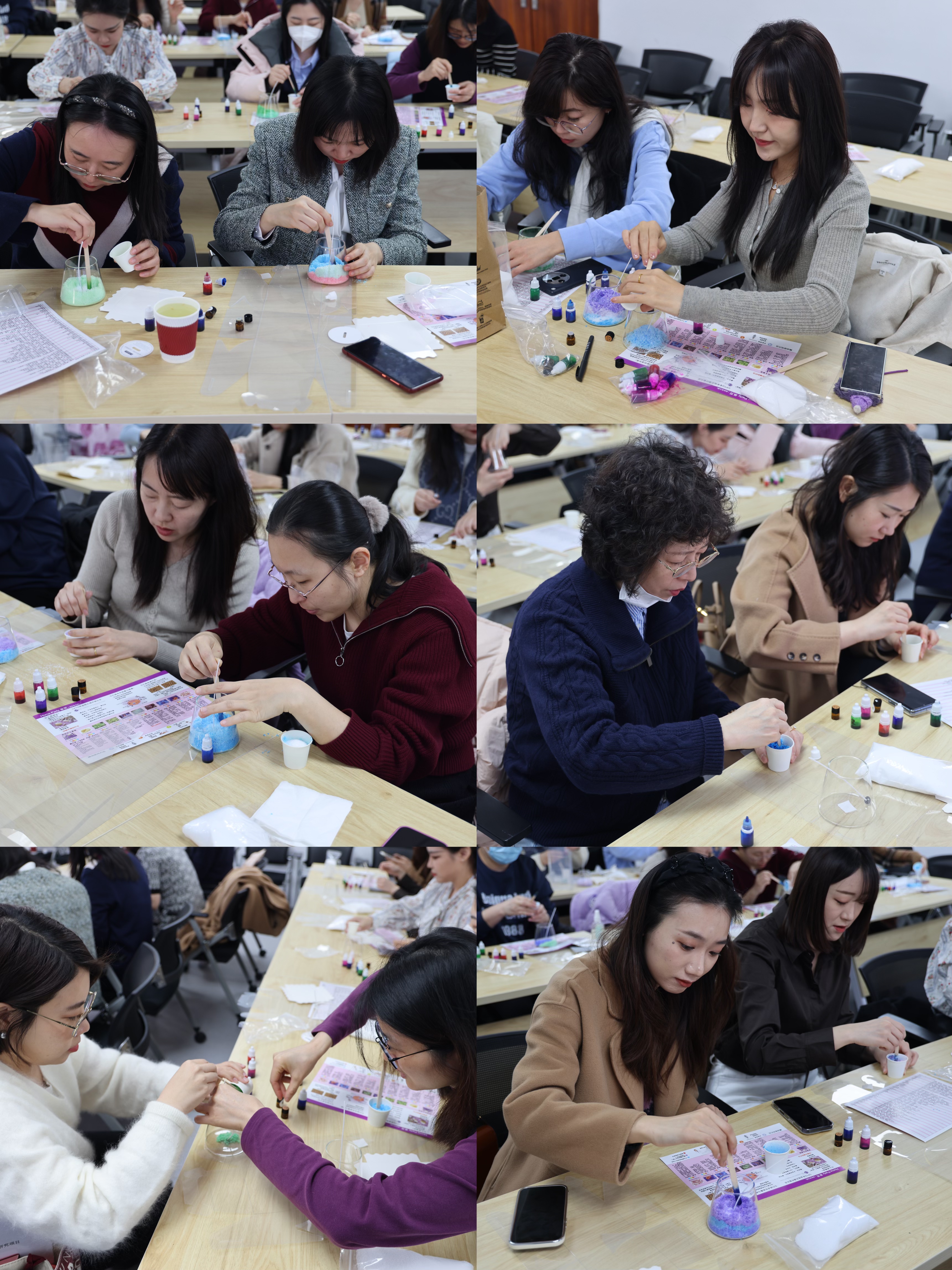 在实践环节,老师们纷纷化身“调香师”,精心挑选心仪的颜色,向容器内细心注入各种颜色的大豆蜡,将创意注入每一件作品,展现独特匠心。活动现场欢声笑语不断,愿这份春日的香气与温暖,伴随每一位“她”书写更美的岁月诗篇。