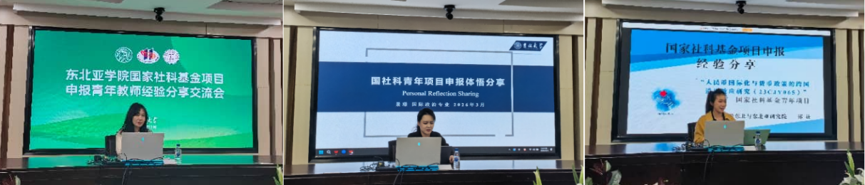 的国家社科基金项目申报质量,发挥青年教师朋辈互助的作用,促进青年教师间的学术交流。会议由崔健副院长主持,周阔、景璟、郑荻、郑国强、徐博五位青年教师结合自身国家社科基金项目申报与立项经验,围绕项目选题、论证设计、申请书撰写等方面的经验与思考展开分享,为与会教师提供了务实而有效的指导。