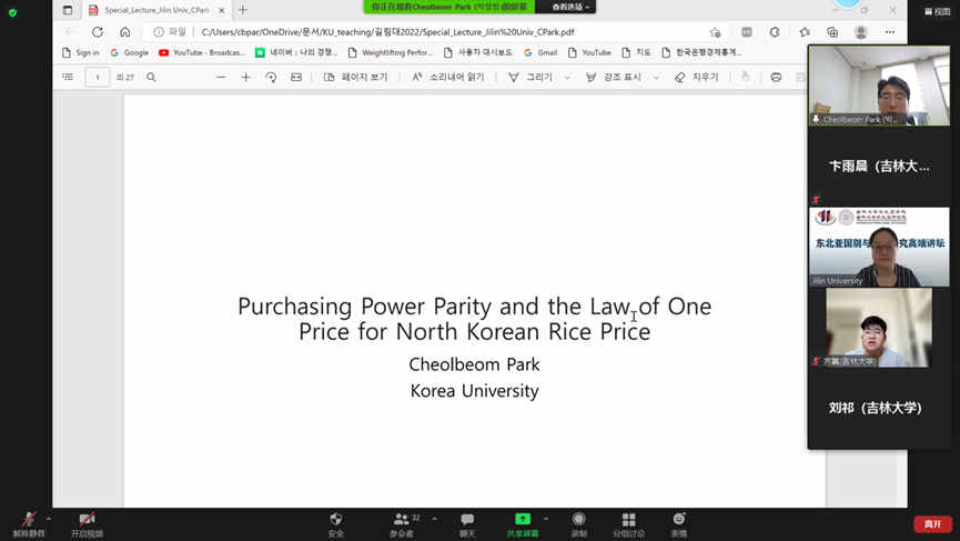 东北亚研究院访问学者,曾任韩国高丽大学经济系主任,主要研究领域为财务金融、宏观经济学,在Journal of Applied Econometrics、Journal of Money,Credit and Banking、Inter national Economic Review、Economic Letters等SSCI期刊发表论文二十多篇。朴哲范教授首先结合实际介绍了购买力平价理论与一价定律的内容,随后分析了购买力平价理论与一价定律的检验模型及其原理,以朝鲜大米价格为基础,利用中、泰、美三国大米价格数据验证了朝鲜大米价格是否遵循一价定律,并讨论了经济制裁对朝鲜的影响。