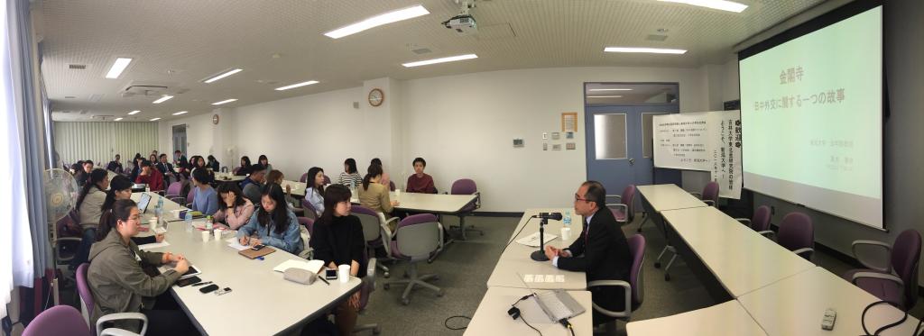 “行•知 日本访学团”由东北亚研究院庞德良副院长任团长,在沈海涛教授等四位老师带领15位博士和硕士研究生组成。抵达新潟市当天,访学团在环日本海经济研究所举行了开营仪式。环日本海经济研究所常务执行理事丸山由明先生会见了访学团,环日本海经济研究所调查研究部长新井洋史研究员为访学团进行了首次讲座并与团员们进行了交流。11月6日,新潟大学法学部真水康树教授和经济学部沟口由己准教授为访学团举行讲座,介绍了当前日本社会的主要特点及中国相关信息在日的传播渠道。讲座后,访学团全体成员与新潟大学的青年学生就中日关系、中日经济合作等话题进行了热烈的讨论。
