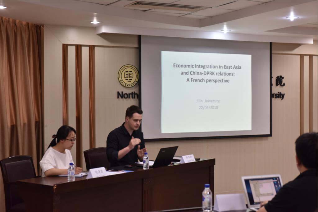 首先Clément Théo做了题为“法国视角下的东亚经济一体化和中朝关系”(Economic integration in East Asia and China-DPRK relations: A French perspective)的学术报告。报告中,Clément Théo先生以中朝关系发展历史为切入点,分析了2002年以来中朝经济合作情况,朝鲜经济政策的调整,并从经济发展和区域安全两方面对当下中朝双边关系进行了深入思考。随后,与会师生与Clément Théo先生围绕中朝关系、中朝经济合作模式、朝韩双边贸易等热点问题进行了深入交流和探讨。