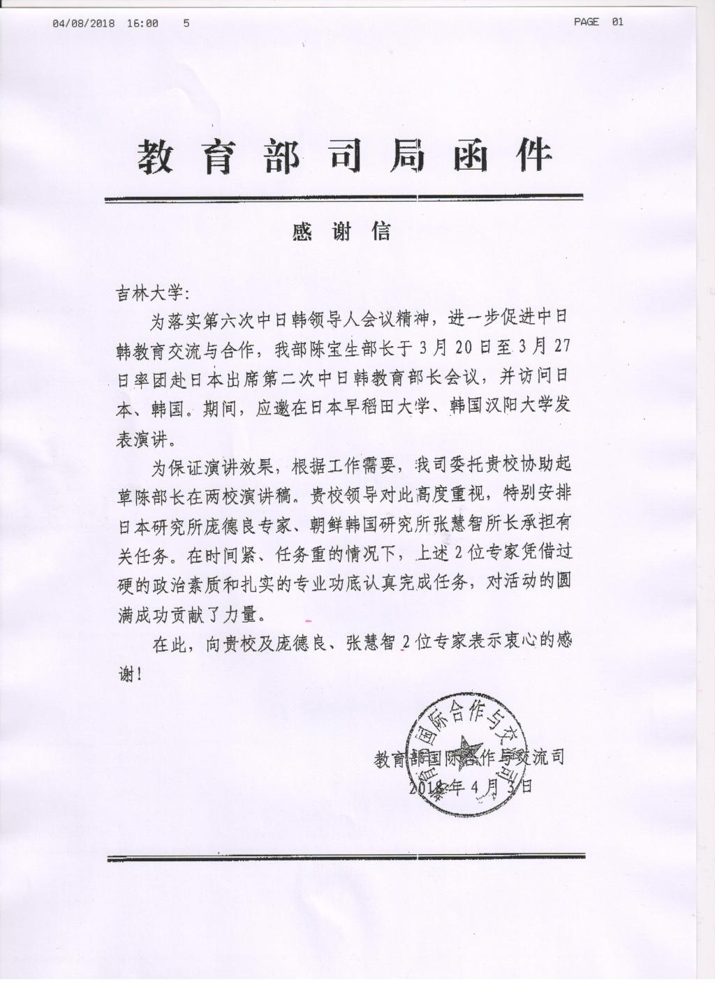 近日教育部国际合作与交流司致信博彩平台 ,对东北亚研究院庞德良教授和张慧智教授表示感谢。