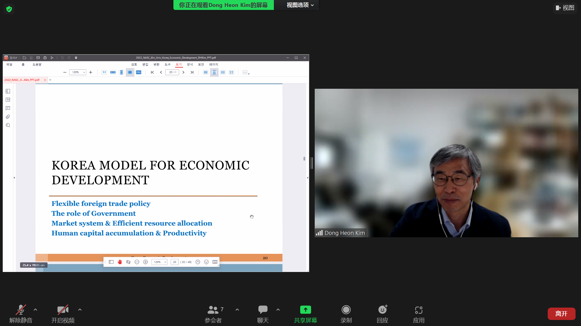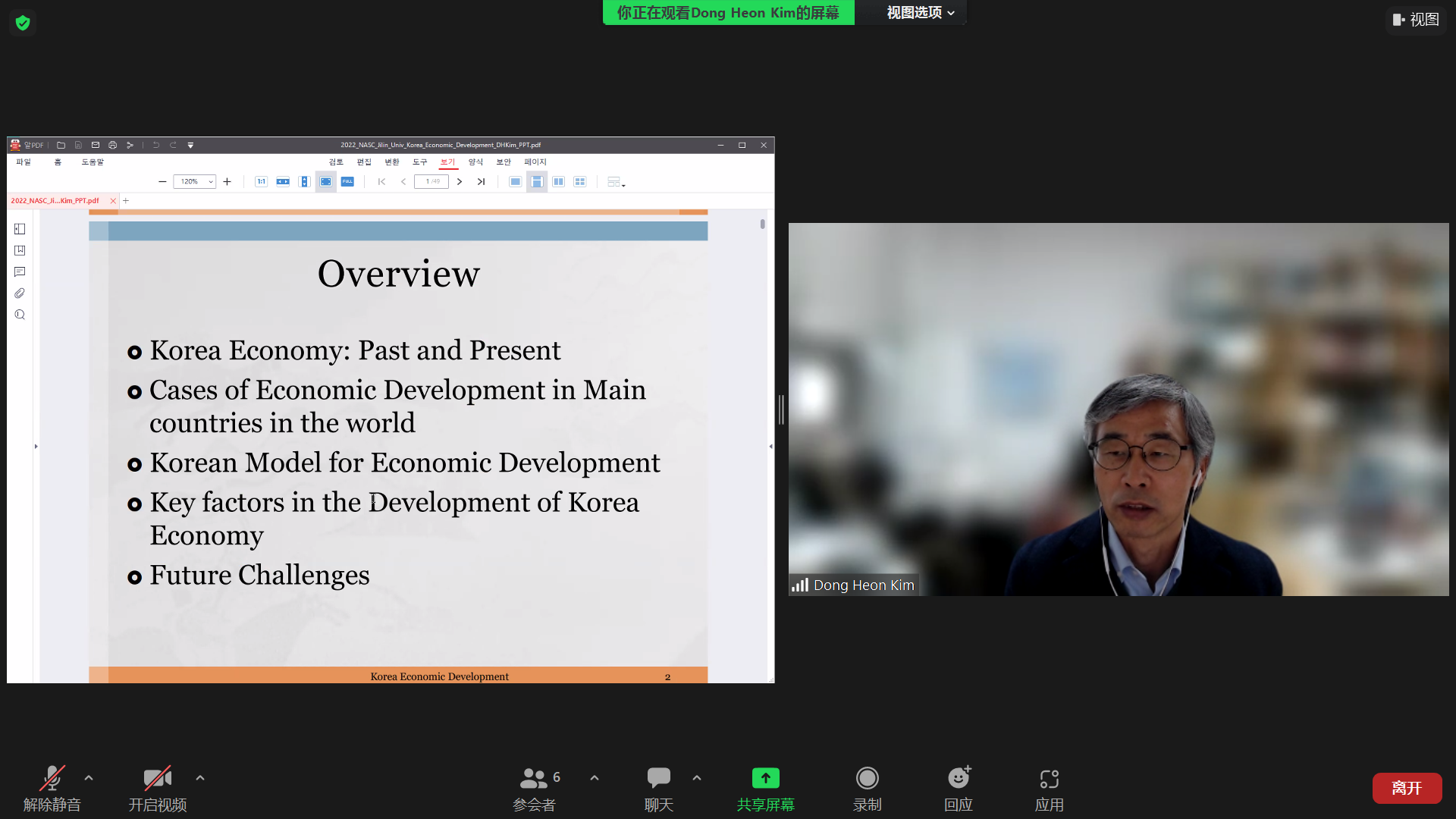 讲座第一部分,金教授选取了GDP增速、通货膨胀率、投资储蓄率、失业率等指标来描述韩国经济的发展历程;讲座第二部分金教授表明韩国的发展离不开经济政策的支持,并指出每个正在发展中的国家都需要根据自己的国情选择自己的发展道路;最后一部分金教授介绍了韩国经济未来发展的挑战,即人口老龄化会对韩国经济产生负面影响。