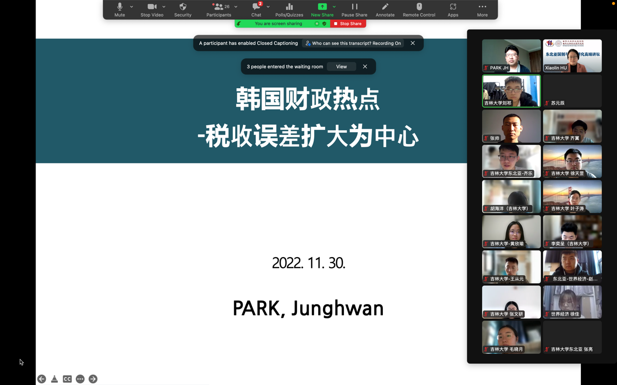 2022年11月30日,“东北亚国别与区域研究高端讲坛”之“韩国的国税收入和财政健全性热点”在博彩平台