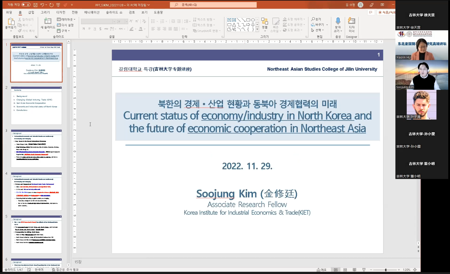 讲座第一部分金博士介绍了中日韩在全球价值链地位的发展进程、分析朝鲜加入全球价值链的前提条件和可能产生的效果、东亚地区区域合作的前景和困难。讲座第二部分金博士介绍了中日韩在全球价值链中的产业发展历史、未来全球价值链重塑的预期、气候环境等问题对全球贸易及供应链的影响。讲座第三部分金博士介绍了东亚地区的经济合作现状。讲座第四部分金博士介绍了朝鲜经济运行及产业现状、国际环境对朝鲜经济发展的影响、朝鲜加入全球价值链的前景展望及前置条件。最后金博士对东亚地区产业合作前景及可能遇到的问题进行展望,阐述朝鲜加入全球价值链对东亚地区的未来发展影响。
