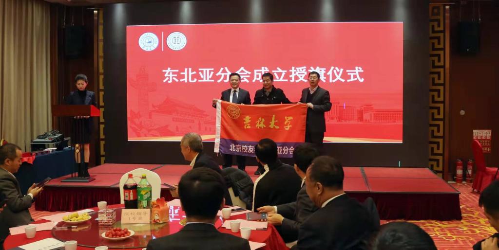 北京校友会东北亚分会的批复”,北京校友会向东北亚分会授予了会旗。东北亚研究院党委书记邱松向全体参会人员转达了边铁副校长、蔡立东副校长和校友联络处迟宪良处长的祝贺,并向首届校友会荣誉顾问和顾问代表颁发了聘书,东北亚分会首任会长陈众、北京校友会会长林学访、荣誉顾问代表李玉潭、顾问代表鲁义、分会代表安洋、分会代表王志红、校友代表龙昊和东北亚研究院院长于潇分别致辞。