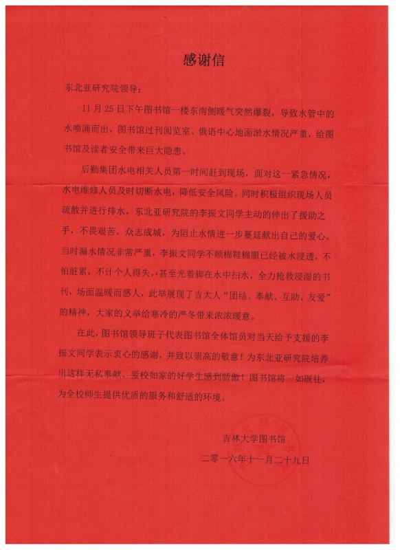 校图书馆感谢博彩平台 李振文同学的感谢信