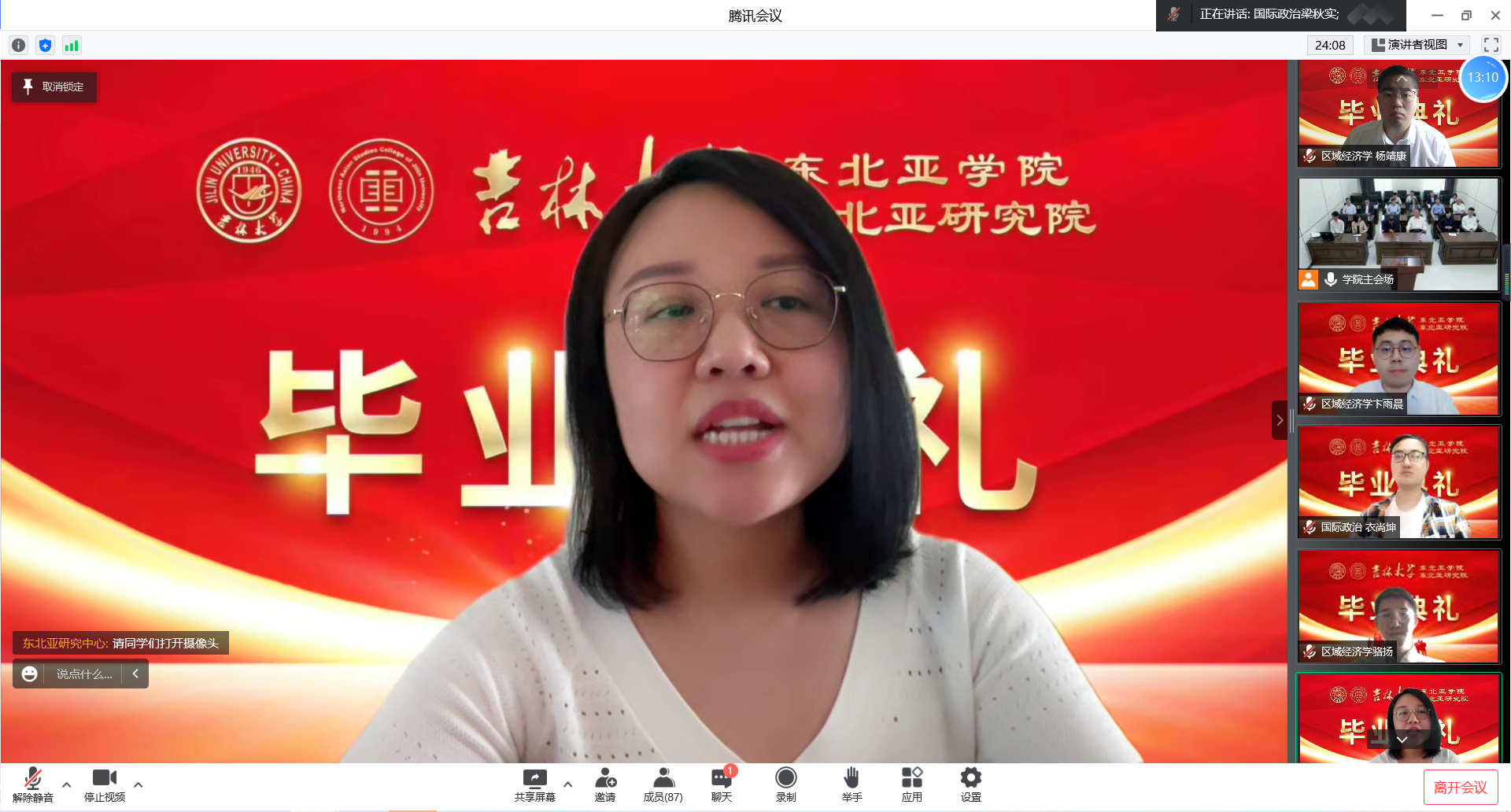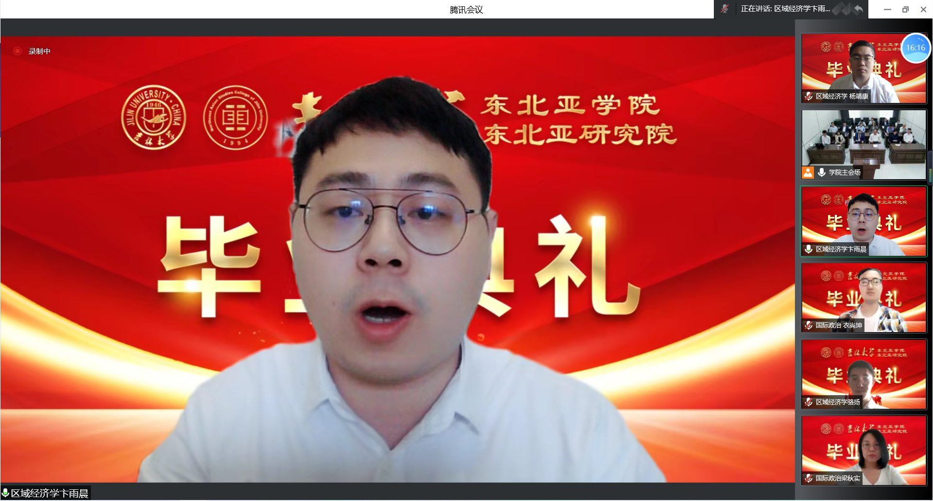 和老师们感恩之情,表达了对同窗之间深厚情谊的不舍之情,并表示会牢记“求实创新,励志图强”的吉大精神,牢记老师们的谆谆教诲,无论未来去往何处,都会展现吉大人,展现东北亚学子的风采。