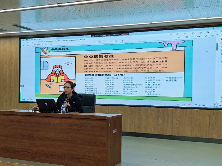五位同学重点分享了他们的选调公考经验。来自人口、资源与环境经济学专业的王一宁同学介绍了中央选调、吉林省选调的基本内容以及他们各自区别于其他省市选调的特点;林建鑫同学详细分享了上海选调的报考时间、具体填写流程、笔试题目类型及出题特点、结构化面试中需要注意的重点难点等,并建议同学们注重日常阅历积累与内在提升;段艺璇同学分享了选调考试相关信息的来源渠道并列举了自己常用的备考材料,建议同学们多加考虑报考条件和报考因素,重点介绍了备考过程和面试经;鲍泓舟同学对求职考公的信息来源渠道做了进一步补充,并鼓励同学们要更加自信、拓宽信息获取渠道、做好时间规划;王从元同学介绍了自己常用的考公信息获取渠道及备考材料,建议同学们“抓紧时间参加考试”,“不要眼高手低”,“不要妄自菲薄”,并提醒大家注意差额政审环节、平衡考公和毕业论文之间的时间分配。